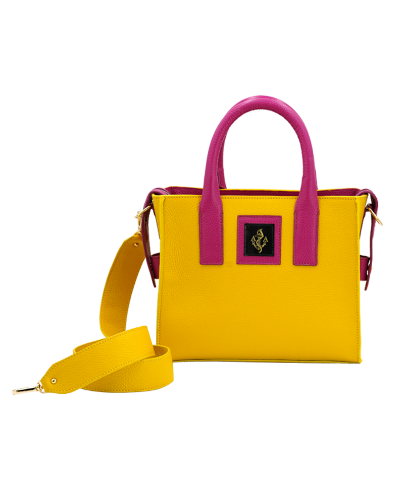 È realizzata in pelle primo fiore, è una borsa rigida ed elegante, presenta due manici e una tracolla rimovibile che consentono di portarla a mano o a spalla.